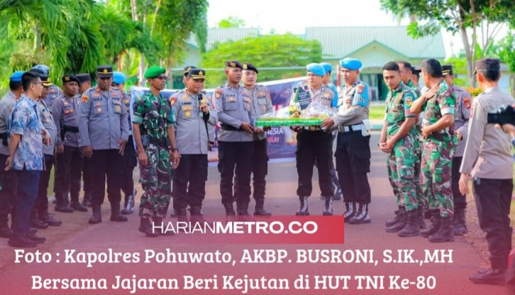 HarianMetro.co, POHUWATO – Momen kebersamaan dan sinergitas antara TNI dan Polri kembali terlihat di Kabupaten Pohuwato. Dalam rangka memperingati Hari Ulang Tahun (HUT) ke-80 Tentara Nasional Indonesia (TNI), Kapolres dan Jajaran Polres Pohuwato memberikan kejutan istimewa kepada Kodim 1313/Pohuwato, Minggu (05/10/2025) pagi.