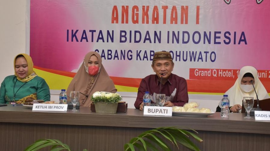 Bupati yang didampingi Sekretaris Dinas Kesehatan, Iriawaty Monoarfa, Ketua IBI Provinsi Gorontalo, Rida Hafid, serta Ketua IBI Kabupaten Pohuwato, Yayun Gunibala, Senin, (14/6/2021) di Grand Q Hotel Kota Gorontalo.