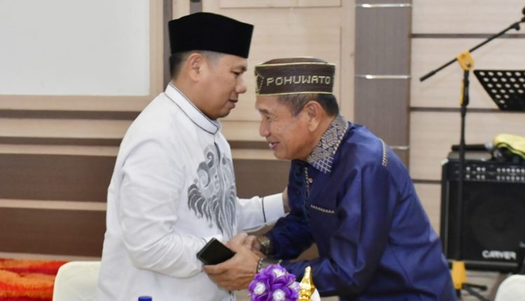 Nampak Bupati bersama istri mengulurkan tangan sambil mengucapkan Minal Aidin Wal Faizin, mohon maaf lahir dan batin. Hal yang sama pula dilakukan Sekda Iskandar Datau, Asisten, Trizal Entengo beserta pimpinan OPD yang secara bergilir menyalami penjabat gubernur dan Ketua TP.PKK Provinsi.