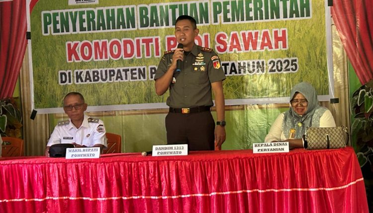 HarianMetro.co, POHUWATO – Komandan Distrik Militer (Dandim) 1313/Pohuwato, Letkol Inf Madiyan Surya, S.Hub.Int., M.Han., menghadiri acara penyerahan bantuan pemerintah komoditi padi sawah kepada para petani di wilayah Kabupaten Pohuwato.