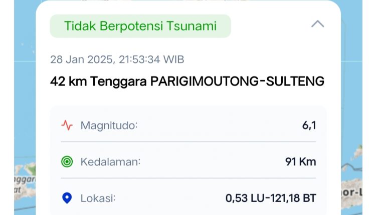 HarianMetro.co, GORONTALO – Telah terjadi gempabumi dengan kekuatan 6.1 Skala Richter (SR) pada Selasa, 28 Januari 2025, pukul 21:53:34 Wita.