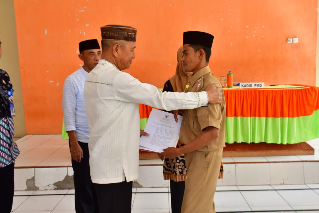 Surat Keputusan (SK) pengaktifan Kades bukit harapan diserahkan Bupati Pohuwato, Saipul A. Mbuinga di Aula Kantor Camat Wanggarasi, Jum’at (4/11/2022).