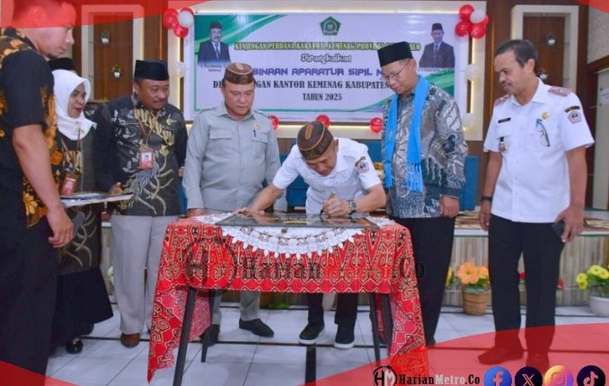 HarianMetro.co, POHUWATO – Kepala Kantor Wilayah Kementerian Agama (Kemenag) Provinsi Gorontalo, Dr. H. Kaswad Sartono, M.Ag, bersama istri, Ny. Suriyati Kaswad, melaksanakan kunjungan perdana ke Kantor Kemenag Pohuwato, Rabu (13/8/2025). Kehadiran mereka disambut secara adat Gorontalo oleh siswa-siswi MTs Al Busryroh Kecamatan Dengilo, dalam suasana yang hangat dan penuh kekeluargaan.