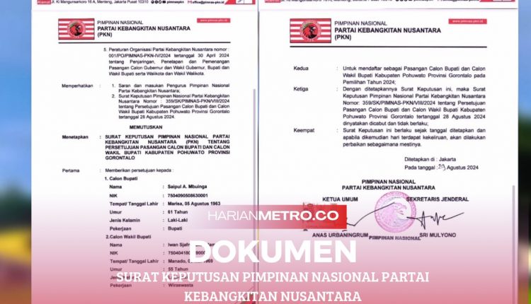 HarianMetro.co, POHUWATO – Partai Kebangkitan Nusantara (PKN) resmi mengeluarkan Surat Keputusan (SK) berupa rekomendasi dukungan kepada Saipul A. Mbuinga dan Iwan S. Adam sebagai Calon Bupati dan Calon Wakil Bupati Pohuwato.