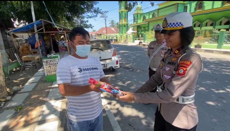 Selain memberikan bantuan sembako, Satlantas Polres Pohuwato juga membagikan bunga kepada pengendara yang melintas di simpang empat Pos Kawasan Tertib Lalu Lintas.