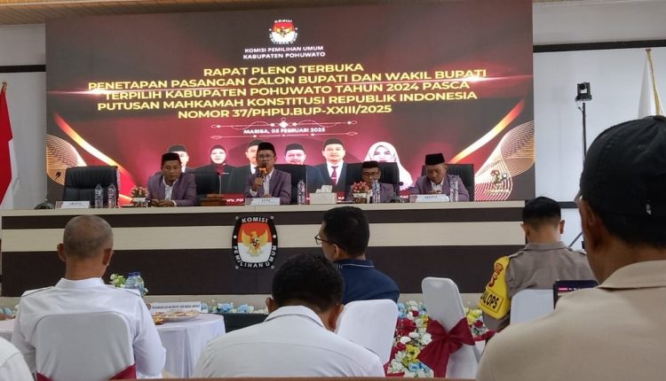 HarianMetro.co, Pohuwato – Komisi Pemilihan Umum (KPU) Kabupaten Pohuwato, menggelar Rapat Pleno Terbuka untuk menetapkan pasangan calon Bupati dan Wakil Bupati terpilih dalam Pilkada 2024, pasca putusan Mahkamah Konstitusi (MK), yang berlangsung di Aula Gedung B KPU Pohuwato, Rabu (5/2/2025).