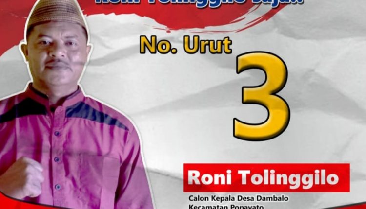 Roni Ismail Tolinggilo yang terkenal dengan julukan Lombohi itu maju sebagai Cakades Dambalo dengan mengangkat visi “Terwujudnya Tata Kelola Pemerintahan Desa Dambalo yang Bersih, Unggul, Agamis, Amanah dan Sejahtera”