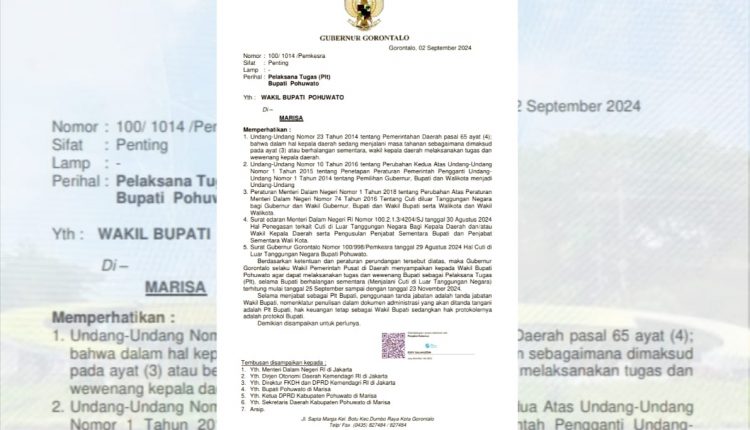 Penetapan ini dilakukan karena Bupati Pohuwato Saipul Mbuinga tengah menjalani Cuti di Luar Tanggungan Negara terhitung mulai tanggal 25 September hingga 23 November 2024.