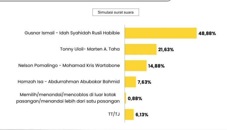 Hasil survei menunjukkan elektabilitas Gusnar-Idah berada di angka 48,8 persen, jauh mengungguli pasangan lain. Pasangan Tony Uloli dan Marthen Taha menempati posisi kedua dengan elektabilitas 21,6 persen, disusul Nelson Pomalingo dan Kris Wartabone dengan 14,8 persen. Sementara itu, pasangan Hamzah Isa dan Abdurrahman Bachmid berada di posisi terakhir dengan 7,6 persen. Adapun 6,1 persen pemilih masih belum menentukan pilihan.