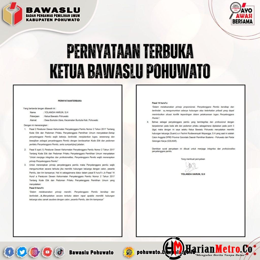 “Sebagai penyelenggara pemilu yang berintegritas dan professional dengan berpedoman pada kode etik dan pedoman prilaku sebagaimana dijelaskan pada point 3 (tiga), maka dengan ini saya selaku ketua Bawaslu Kabupaten Pohuwato menyatakan memiliki Hubungan keluarga (Suami) a.n Fachmi Rudiawansyah Mopangga, SH. yang saat ini adalah Calon Anggota DPRD Provinsi Gorontalo Daerah Pemilihan Boalemo – Pohuwato dari Partai Golkar,” Tugkas Yolanda.